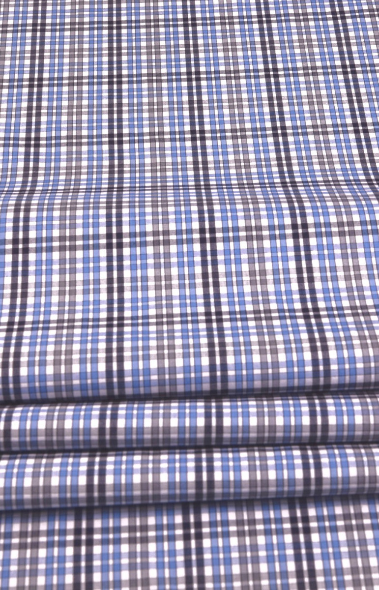 Camisa de algodón con cuadros finos blancos, grafito y azules es 100% natural, reciclable. La ropa hecha de ella es perfecta para los días calurosos. Lo recomendamos para coser camisas, blusas, vestidos o faldas.