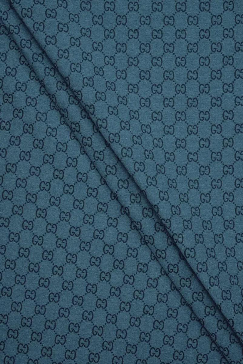 Tejido de algodón italiano con la adición de poliamida en color vaquero con un motivo bordado de letras. El patrón es regular, hecho en negro y representa los símbolos de una marca de moda global muy conocida. El ancho de un motivo de letra es de 1,5 cm y la altura de 1,3 cm. La tela es carnosa, inelástica, mate y bastante rígida, que recuerda al vaquero. Es perfecto para coser una chaqueta, una katana, pantalones y un vestido.