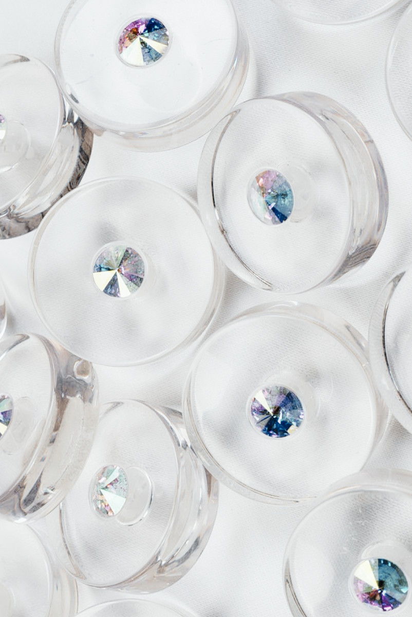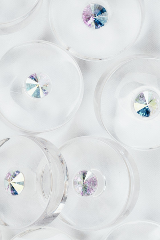 Pelo, botón transparente con un diámetro de 3cm y un grosor de 0,9cm. Además, está decorado con una piedra de holograma en el interior, que brilla en diferentes colores, según el ángulo de incidencia de la luz. El botón es muy efectivo y ligero. Por su tamaño, es ideal para enriquecer un abrigo, chaqueta, chaleco o chaqueta.