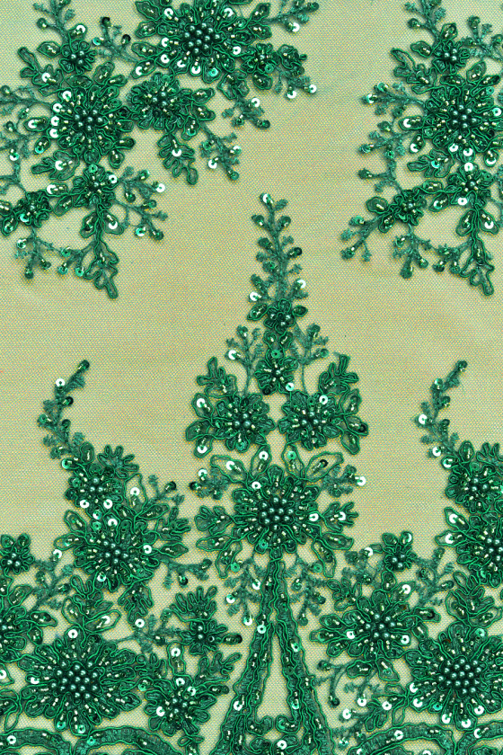 Tejido de noche de encaje italiano en color verde, confeccionado en tul del mismo color con motivos florales bordados uniformemente con un tamaño de 10 cm*20 cm. Está ricamente decorado con lentejuelas verdes, cuentas y perlas y adornado con un hilo verde que hace que el patrón sea ligeramente convexo. Los bordes de la tela están terminados con un diente ancho y decorativo: lo cosemos circunferencialmente.