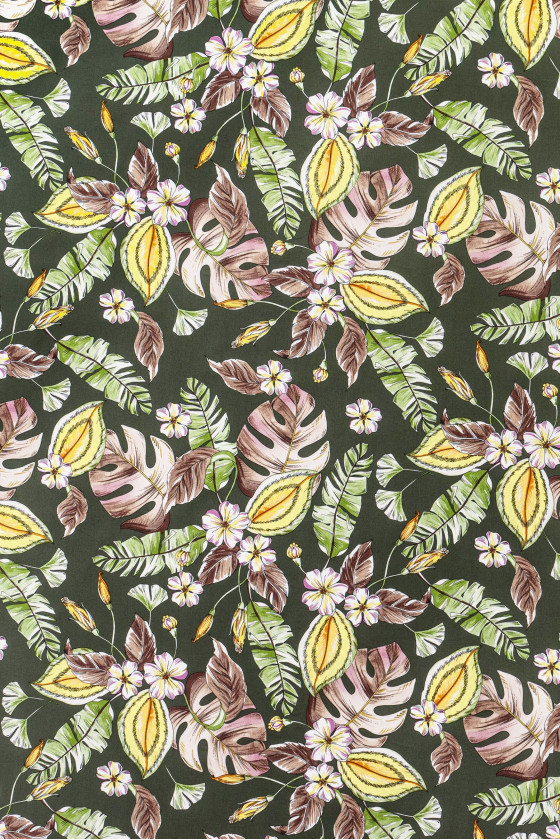 Tejido de algodón italiano en color caqui con motivo de hojas y flores exóticas.