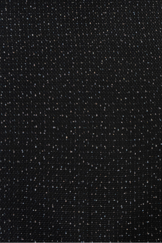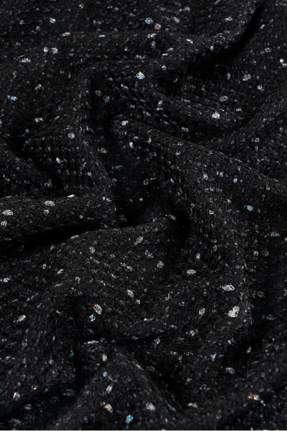 Tela de traje de chanel italiana en color negro, decorada con hilo de lúrex en color plata y multicolor. Una tela suave y carnosa con un tejido interesante, perfecta para coser un traje, un vestido, una falda, pantalones cortos.