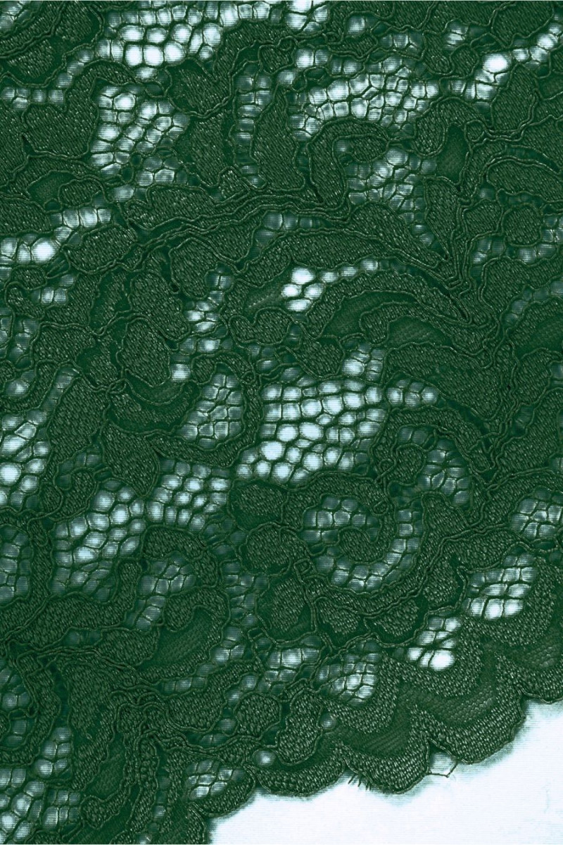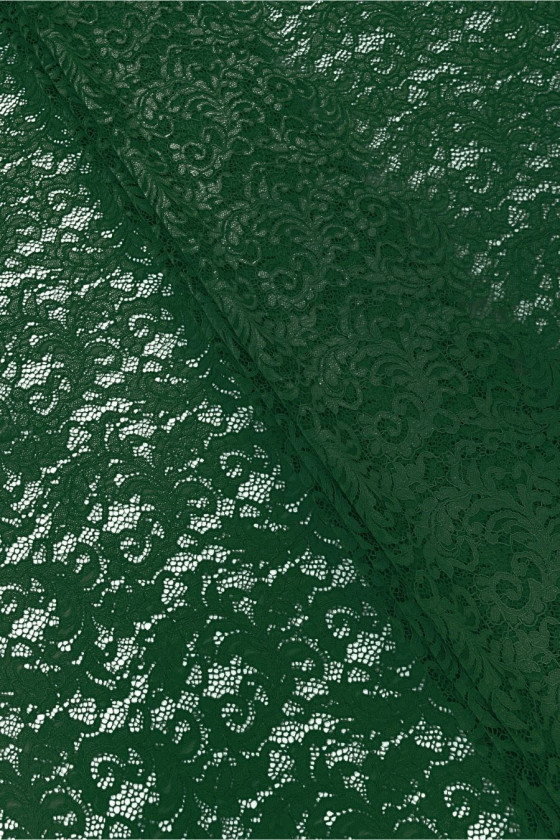 Encaje italiano en color verde. La tela tiene un denso motivo floral conectado con malla y terminado con un cordón. La corona está acabada en ambos lados con un diente decorativo: la cosemos de forma circunferencial. Una propuesta maravillosa que funcionará tanto en atuendos formales como para el día a día.