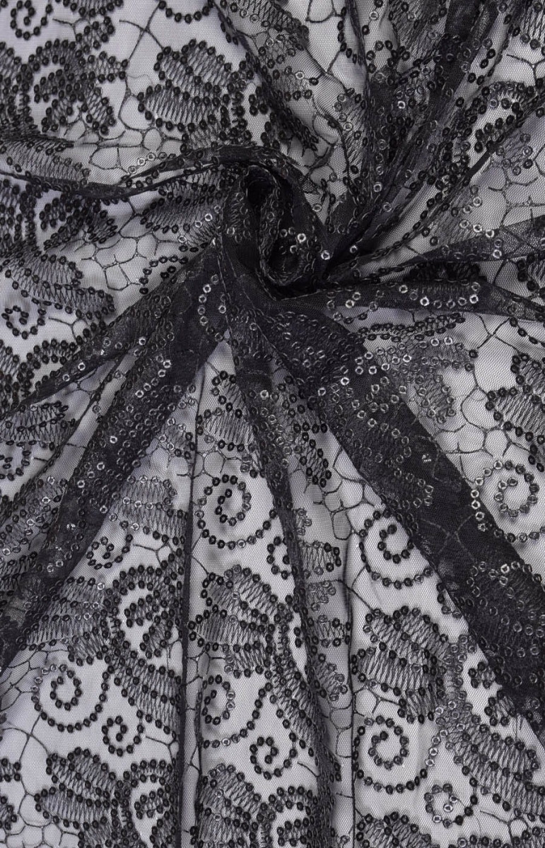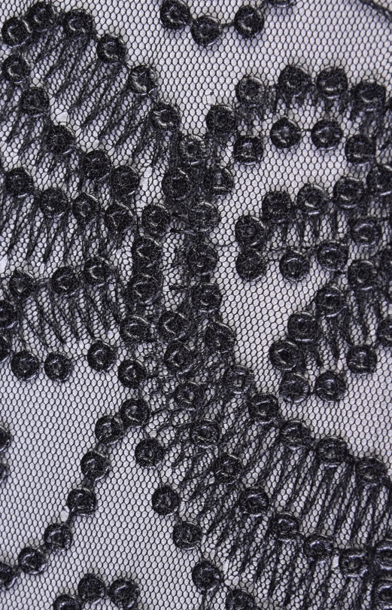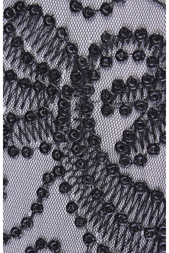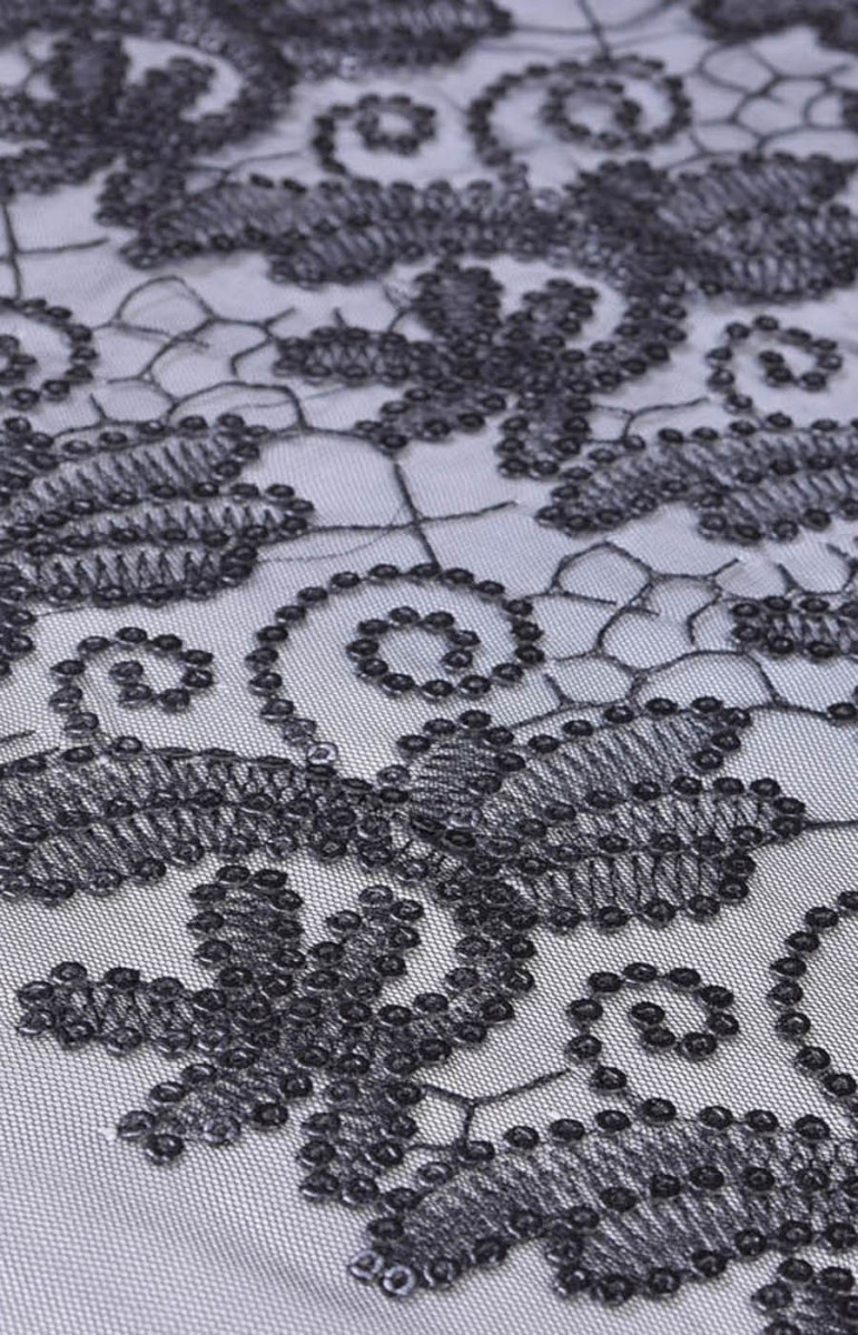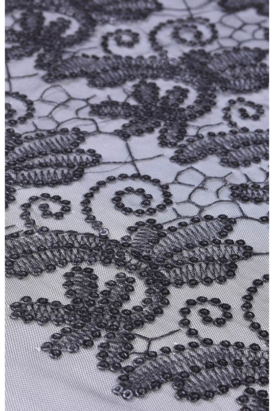 Sobre el tul negro hay flores bordadas con lentejuelas hechas de cuero ecológico. El conjunto crea una hermosa composición.