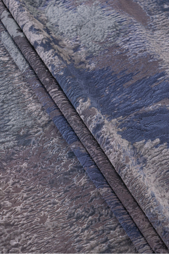 Tejido jacquard italiano en color gris-tórtola. Un motivo de lugares interesantes a la camuflaje.
