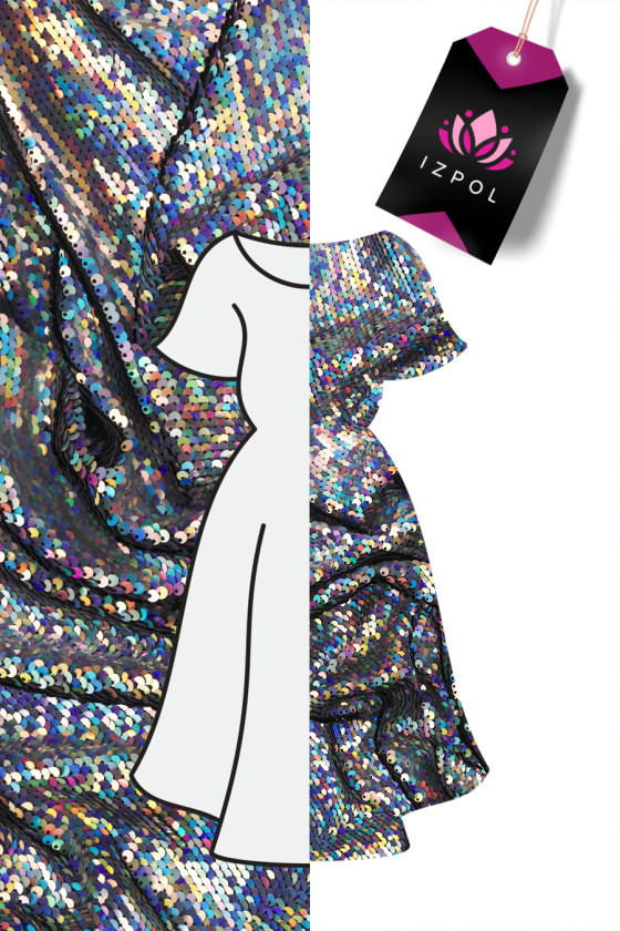 Tela de noche italiana: lentejuelas volteadas por un lado negras y lentejuelas de holograma por el otro, cosidas en una tela de punto elástica. La tela es pesada, bellamente brillante, elástica. Perfecto para coser un vestido de noche, blusa o falda.