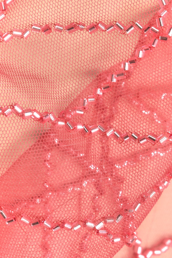Tul rígido italiano con ojales corales clásicos. Está sutilmente decorado con cuentas cilíndricas del mismo color. Forman un patrón geométrico en forma de diamante que se engrosa hacia un borde de la tela (no hay acabado decorativo). La tela es muy efectiva, transparente (requiere forro), pesada, ligeramente elástica: la cosemos circunferencialmente. Una fantástica propuesta para coser un vestido de noche, una falda o una blusa en una edición muy interesante.