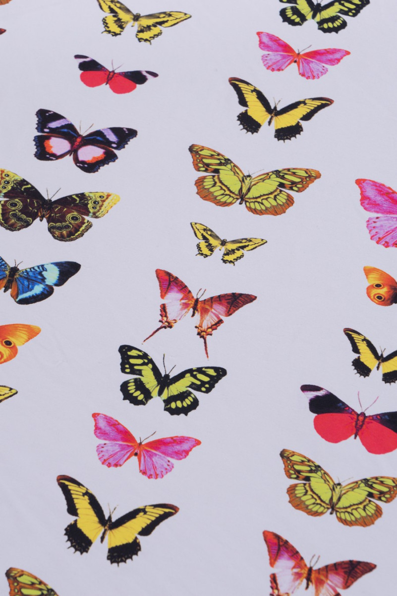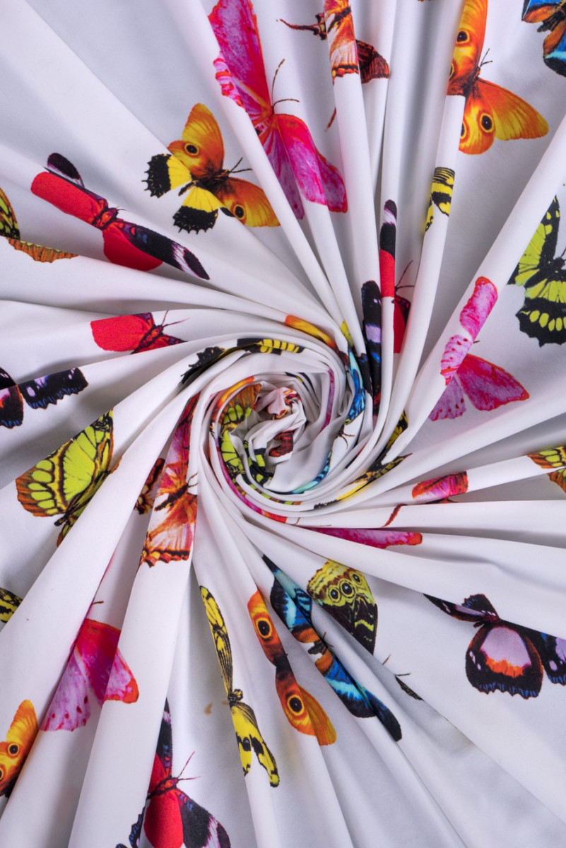 Tela de punto de lycra con mariposas de colores sobre fondo crudo. El tejido de punto es muy elástico, opaco y mate. Perfecto para blusas o vestidos de verano, faldas o pareos de verano.