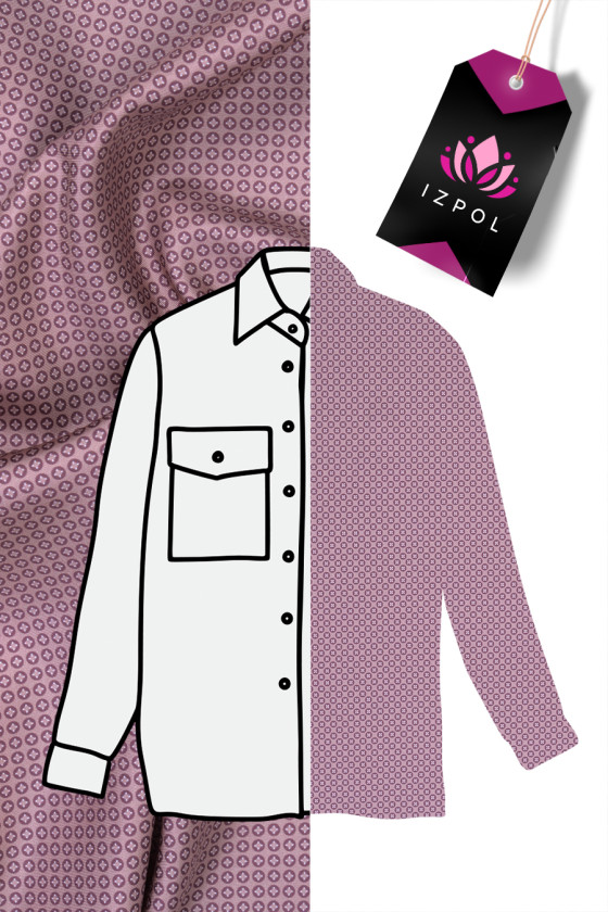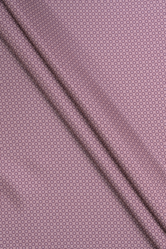 Tejido italiano de sarga 100% seda en color rosa sucio con un fino estampado. Un patrón pequeño muy bonito (0,4 cm) en color burdeos con relleno de salmón. Su forma se asemeja a los lunares y está muy densamente espaciado. La tela es fina pero opaca con un delicado tejido de sarga, perfecta para coser una camisa, un vestido o una bufanda. Una propuesta fantástica para los amantes de los pequeños estampados en colores tenues.