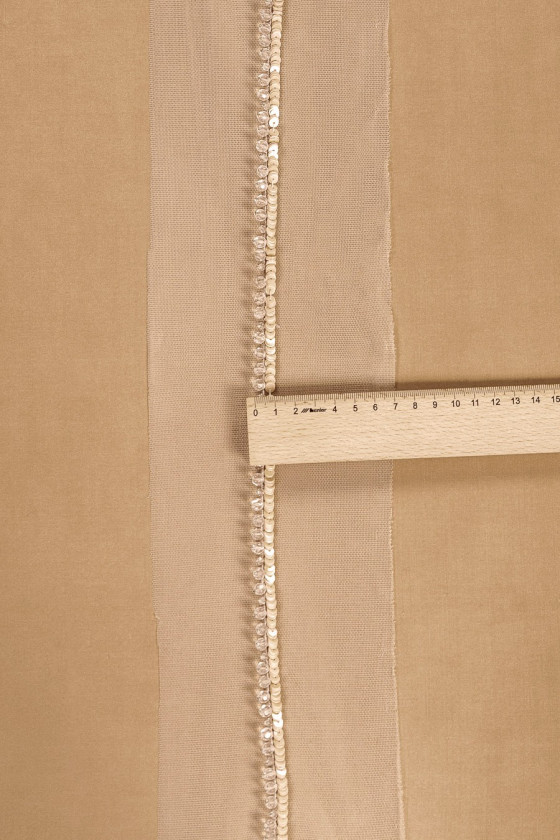Cinta de mercería italiana hecha de grandes cuentas transparentes y lentejuelas en color albaricoque. El conjunto está cosido sobre una suave malla de tul.