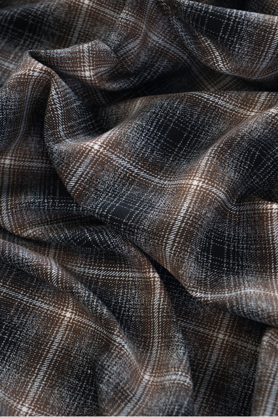 Tela de traje italiano con motivo de cuadros (6 cm) en color negro, gris y marrón. Un tejido suave con un tejido denso que se asemeja a la lana. Perfecto para coser un traje, vestido, pantalón o falda, chaqueta.