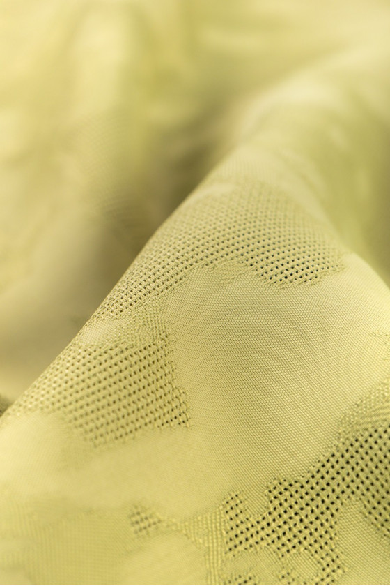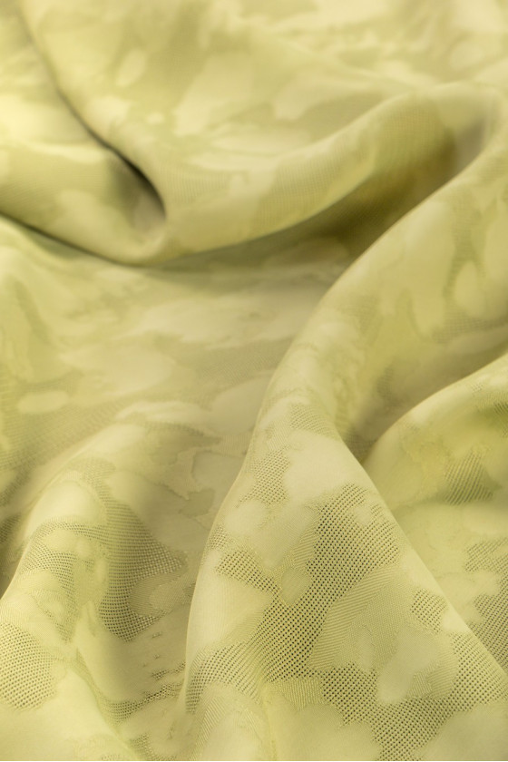 Tejido de viscosa italiana con tejido de malla. Motivo de parches/motas en color oliva.