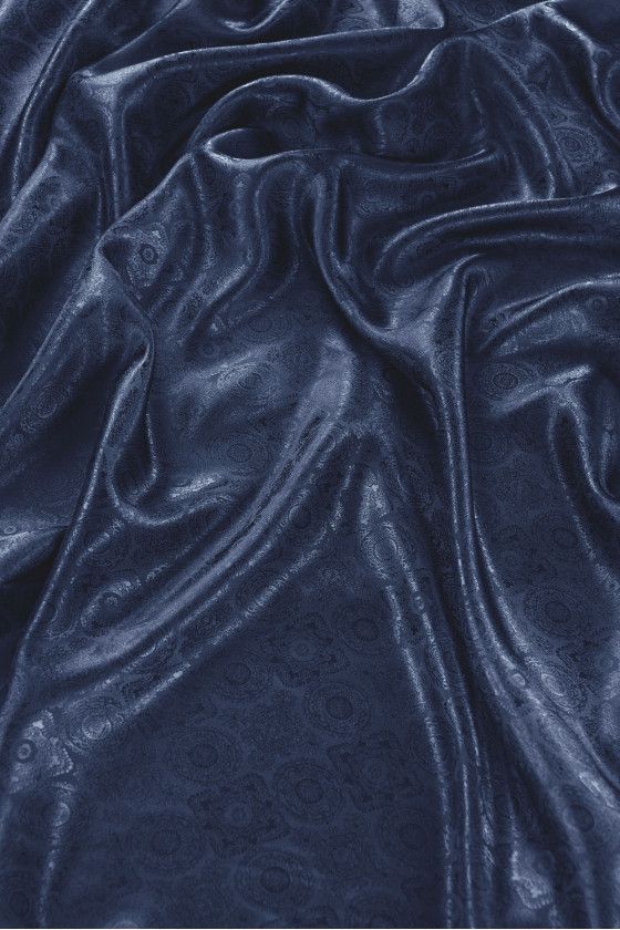 Forro de jacquard italiano en color azul-morado. El patrón más de moda de adornos orientales. El tejido no es elástico, ligeramente brillante. Perfecto para forrar abrigos, chaquetas, chalecos, chaquetas.