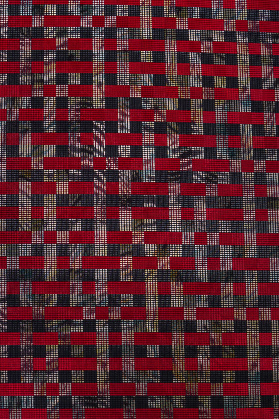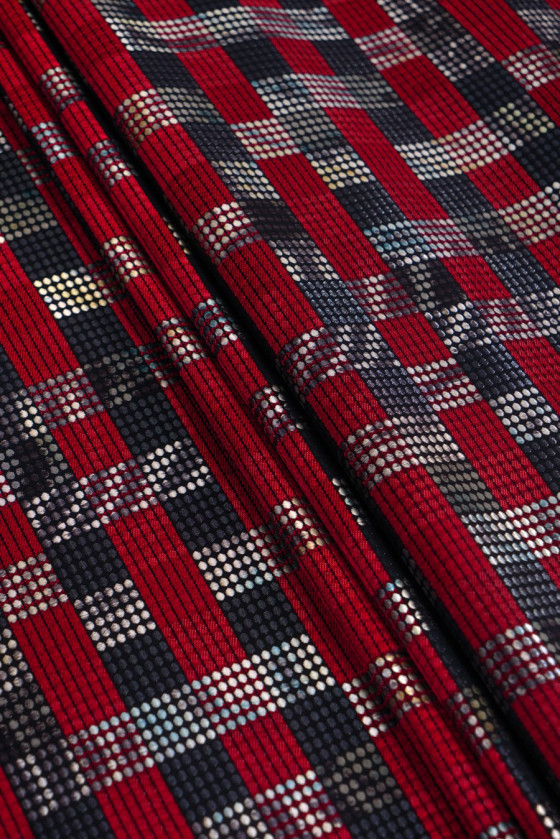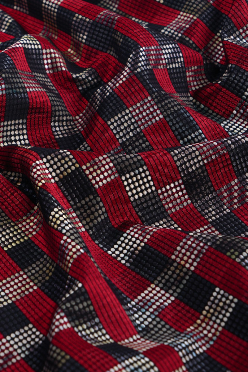 Tela de traje jacquard italiano con un motivo geométrico muy interesante. El patrón se compone de rayas rojas y negras entrelazadas irregularmente con bordados en forma de pequeños puntos sombreados. El conjunto da un efecto muy bonito de una rejilla de 3 cm de ancho. La tela es muy original en una combinación de colores clásica. Es perfecto para coser un traje, falda, vestido o como tela decorativa.