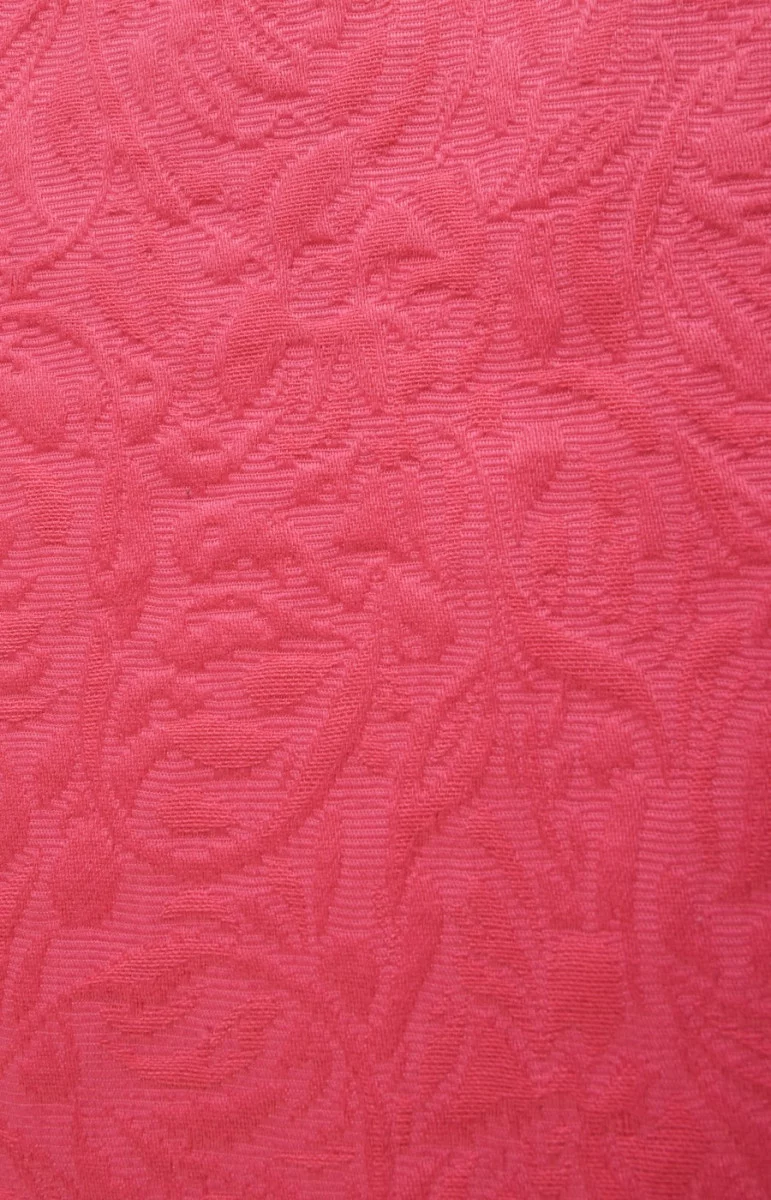 Tela jacquard italiana en un hermoso color rosa con un patrón floral densamente repujado. El tejido es suave y agradable al tacto, elástico, mate. Perfecto para faldas, pantalones, chaquetas o vestidos de verano.