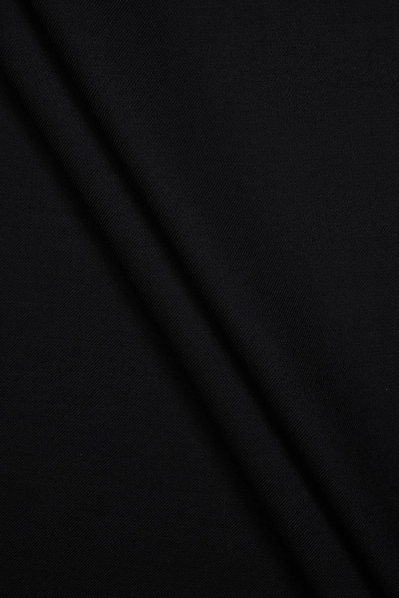 Tela de traje italiano con la adición de lana en negro, un material de muy buena calidad, carnoso, perfecto para cualquier temporada. Tela más gruesa con una superficie lisa con una estructura que se asemeja a un tejido de sarga. La tela es ligeramente elástica, maleable y resistente, perfecta para coser una chaqueta, un disfraz, un pantalón o un vestido atemporales y más gruesos.