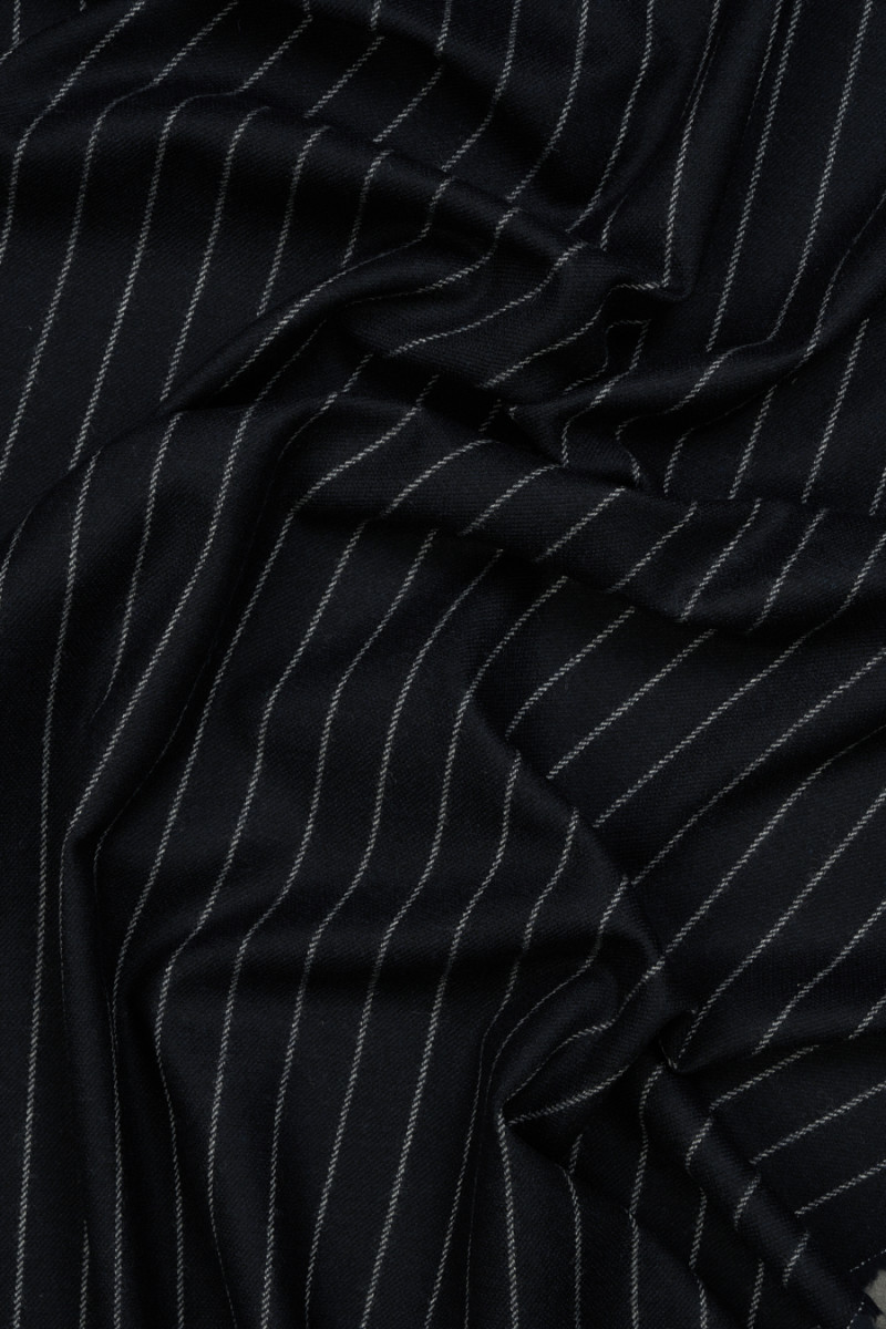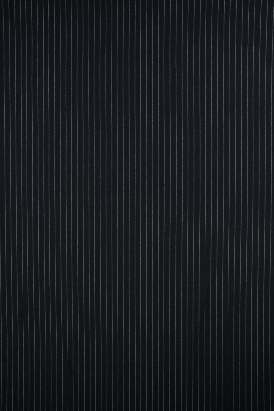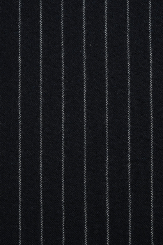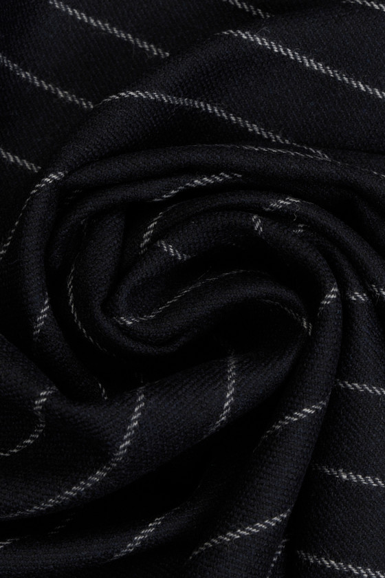 Tejido 100% lana en dos colores: negro y azul marino muy oscuro con rayas blancas. El patrón regular de rayas se produce cada 2,5 cm y está formado por líneas diminutas. El tejido es de grosor medio, suave, no elástico y mate. Una propuesta clásica perfecta para ropa cálida de invierno, como chaquetas, pantalones, chalecos y vestidos.