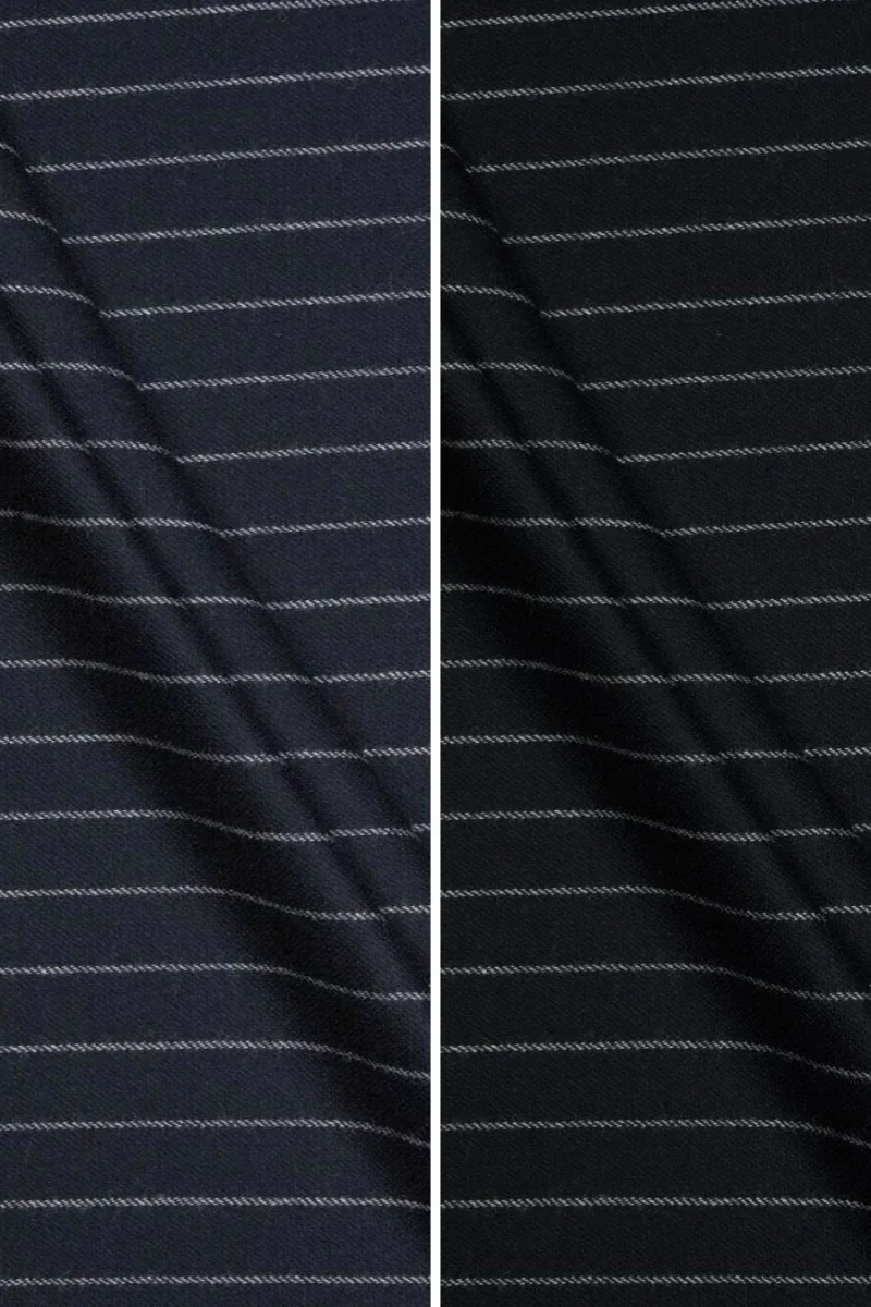 Tejido 100% lana en dos colores: negro y azul marino muy oscuro con rayas blancas. El patrón regular de rayas se produce cada 2,5 cm y está formado por líneas diminutas. El tejido es de grosor medio, suave, no elástico y mate. Una propuesta clásica perfecta para ropa cálida de invierno, como chaquetas, pantalones, chalecos y vestidos.
