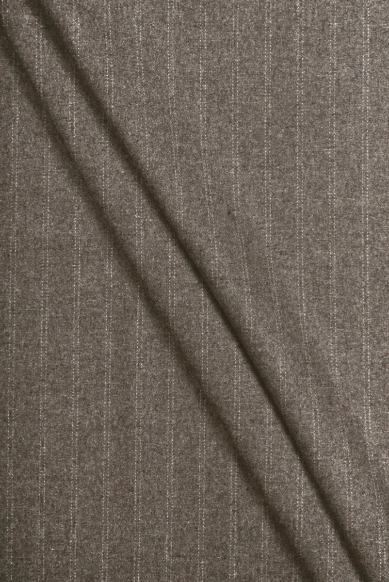 Hermosa tela de disfraz hecha de lana natural con una mezcla de poliéster en color gris-beige con un tejido melange. La tela tiene un aspecto clásico y elegante con un delicado patrón de rayas: rayas dobles verticales delgadas y regularmente espaciadas en un color más claro de 2 cm de ancho. La estructura del material tiene un acabado mate con un tejido ligeramente visible, lo que le da un carácter noble y formal. La tela es suave, no elástica con grosor medio, adecuada para estaciones más frías (otoño, invierno, principios de primavera). El patrón acanalado adelgaza la silueta, es especialmente apreciado en la moda masculina y de negocios.
