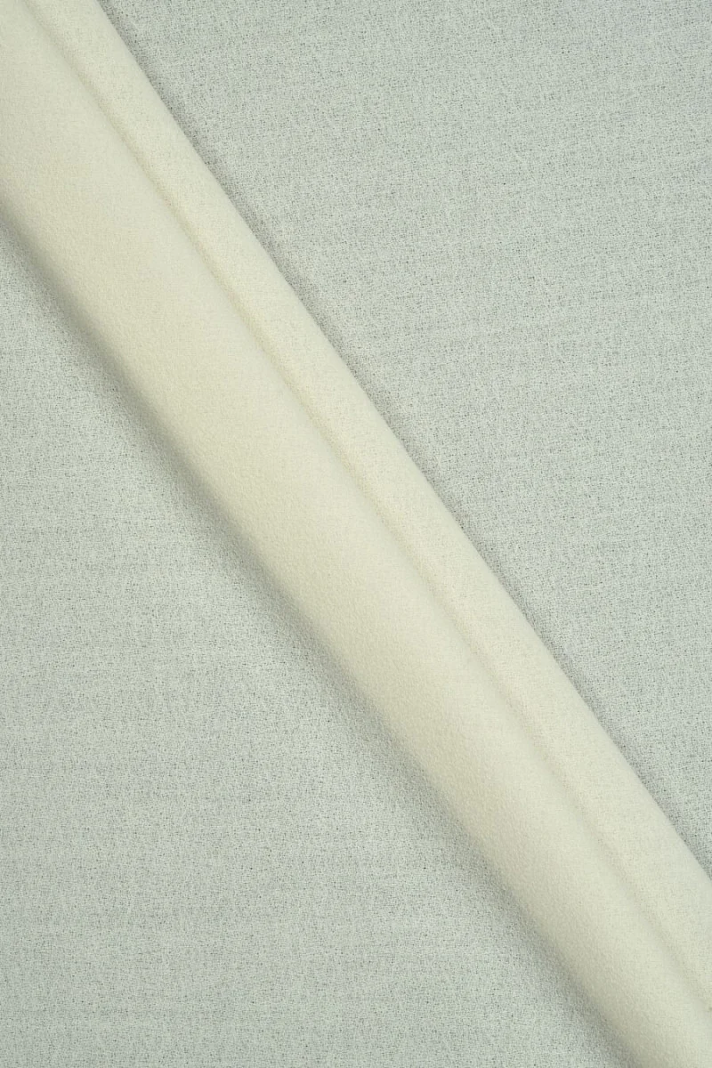 Tela de vestuario italiana tejida con lana 100% natural en color écru. Tela con tejido georgette mate (con grano), inelástica y ligeramente transparente. Perfecto para coser un vestido o falda elegante.
