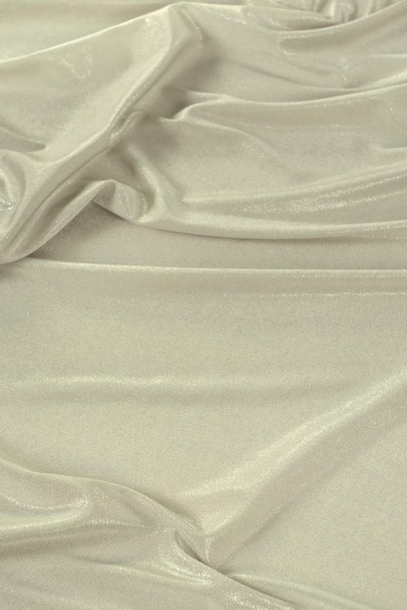 Tejido de poliéster italiano en beige frío con un fino hilo plateado que crea un efecto brillante y brillante. Tejido de punto elástico, pesado y fluido: perfecto para coser una blusa o un vestido de noche.