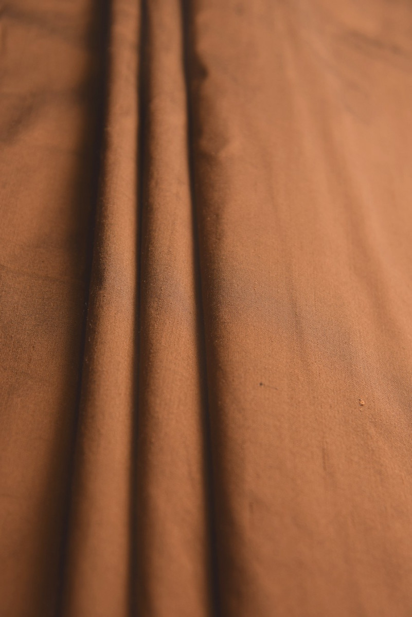La seda shantung bicolor (hilo negro y beige) en marrón (chocolate con leche) con una estructura lisa que se asemeja al tafetán, es una tela de tejido suelto, teñida de forma natural. ¡Solo limpieza en seco!