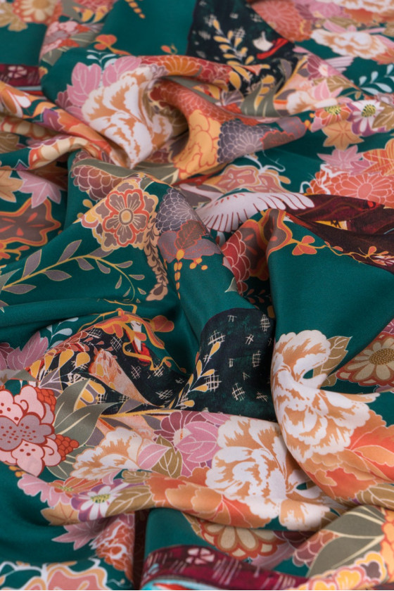 Tela italiana 100% seda con un motivo oriental de flores pastel, pájaros y figuras ocultas sobre un fondo verde. Imprime en el lado mate.