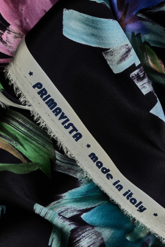 Satén de seda italiano con adición de elastano con un motivo de grandes flores pintadas a pincel sobre un fondo azul marino muy oscuro. Patrón denso hecho en tonos turquesa y rosa jaspeado, la flor más grande mide 23 cm * 27 cm. El tejido es fluido, suave, elástico y bellamente brillante, lo que le da una elegancia única. Es perfecto para vestidos vaporosos, faldas, blusas y camisas.