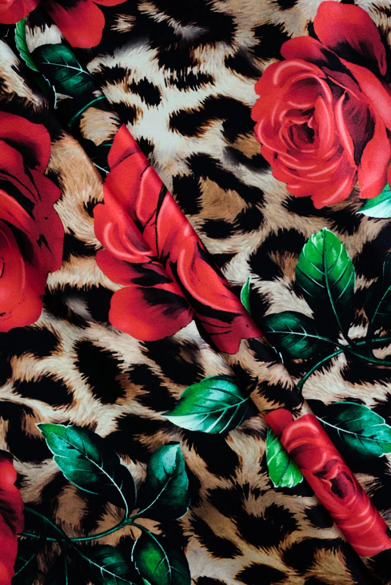 Satén de seda italiana con la adición de poliamida con motivo de estampado de leopardo y grandes rosas. El fondo animal está hecho en tonos beige y marrón con manchas negras densamente colocadas características de la pantera, y sobre él rosas rojas con tallos verdes. La flor más grande mide casi 17 cm de ancho y 15,5 cm de largo. La tela es fluida, aireada, suave, elástica y opaca. Lo recomendamos para blusas, camisas, vestidos y faldas.