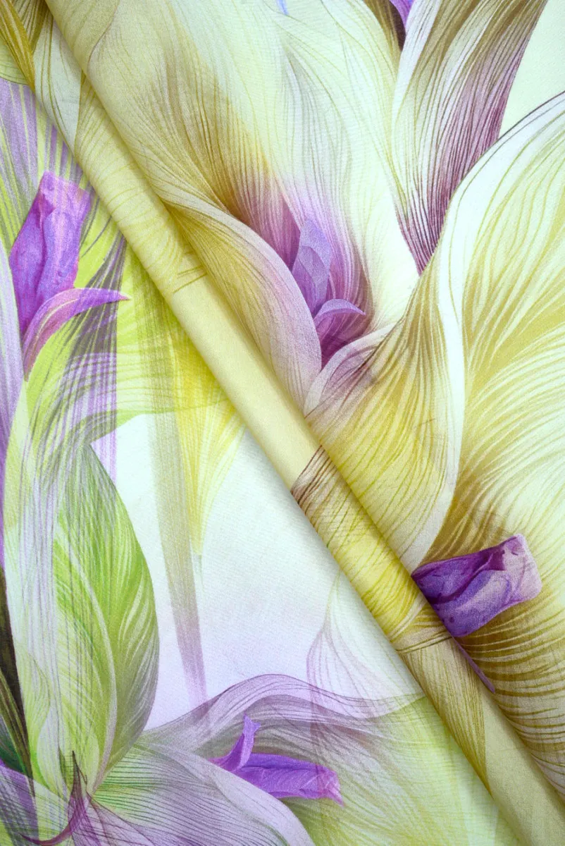 Muślin jedwabny kwiaty limonka z fioletem