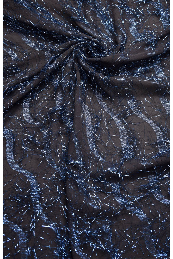 Un tejido hermoso y aireado hecho de seda natural. El tejido no es elástico, ligeramente transparente. Perforado, entrelazado con hilos de lúrex azul aciano. El lúrex forma un patrón ondulado. La tela es perfecta para vestidos de noche o blusas.