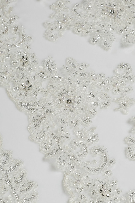 Cinta de encaje italiano en color blanco con acabado de dientes en una de las caras. Motivo floral ricamente bordado con abalorios y lentejuelas en blanco y plata. Ideal para el acabado de telas de boda y noche.
