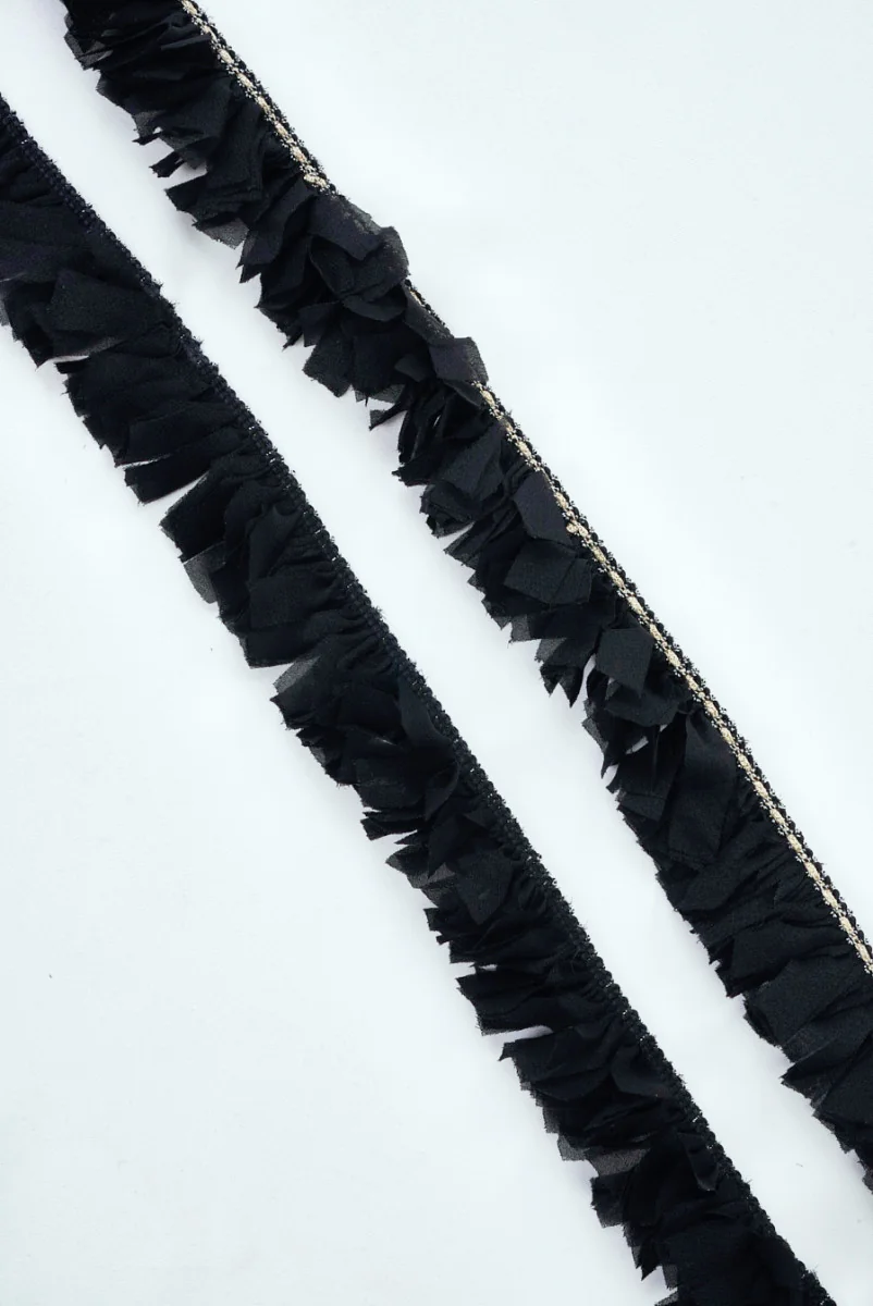 Cinta de mercería italiana en forma de borlas de 3,3 cm de largo. Las borlas miden 1 cm de ancho y están rematadas con un cordón beige en la parte superior. La cinta es perfecta para el acabado de tejidos lisos y chanel.