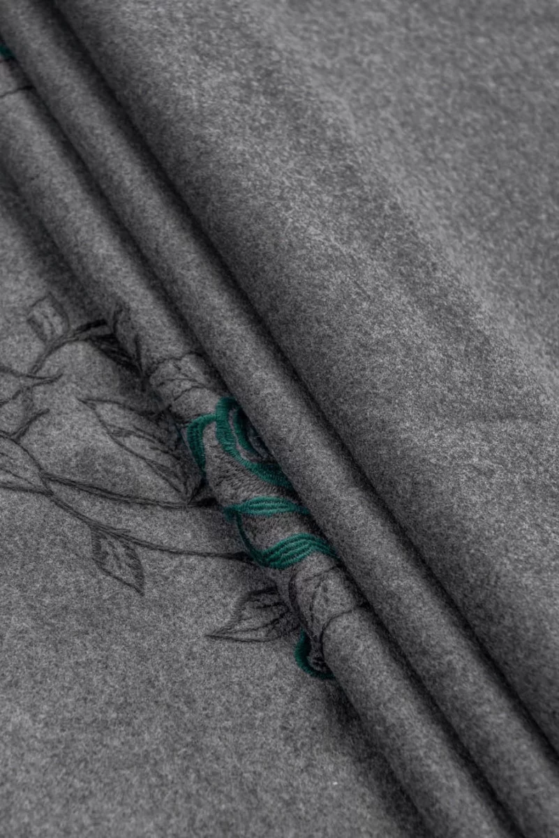 Tejido de abrigo italiano - gris con bordados florales en color gris verdoso, tejido con lana 100% natural. Los tejidos de lana son ideales para prendas de abrigo (abrigo, chaqueta, chaleco) porque calientan y al mismo tiempo permiten que la piel respire. La tela está cosida circunferencialmente.