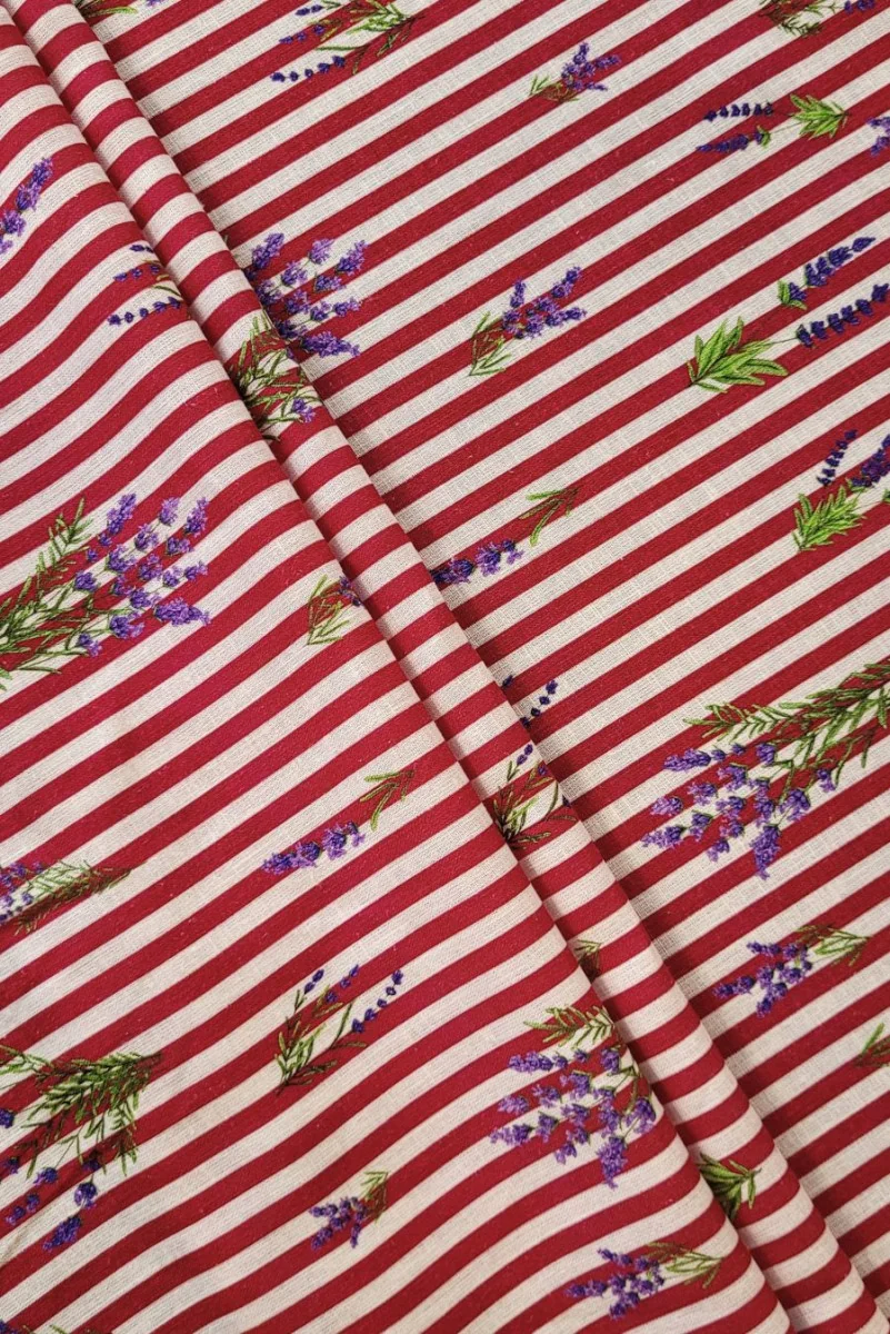 Tela italiana hecha de una mezcla de lino y algodón en una versión veraniega. El patrón consiste en franjas verticales regularmente espaciadas en color crema y rojo con un ancho de 0,7 cm; una decoración adicional aquí son ramitas lavanda moradas. La tela es suave, inelástica, mate y hecha de tejido suelto, ligeramente transparente. Una propuesta ligera y atemporal: perfecta para vestidos de verano, blusas, faldas o pantalones cortos.