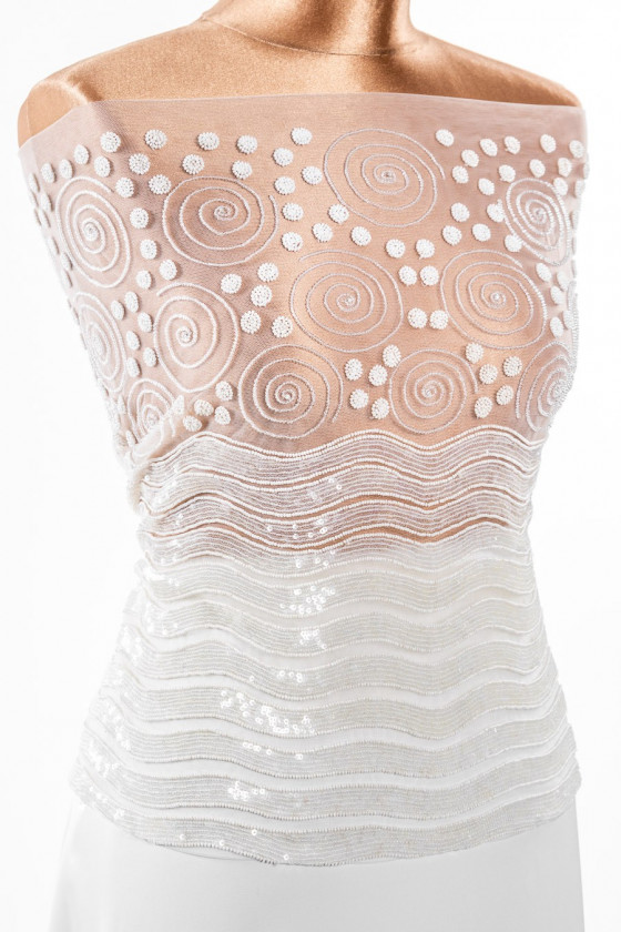 Aplique de boda italiano en forma de corsé (blusa - frente) en color crema. La parte superior del aplique tiene un hermoso motivo de patrones geométricos (6 cm) hecho de cuentas transparentes, complementado con lunares más finos (1,5 cm) en color perla, la parte inferior con un motivo de ondas (1,8 cm) relleno de lentejuelas transparentes y rodeado de cuentas de perlas. El conjunto está cosido sobre tul suave. Una hermosa decoración para un vestido de novia o de noche.