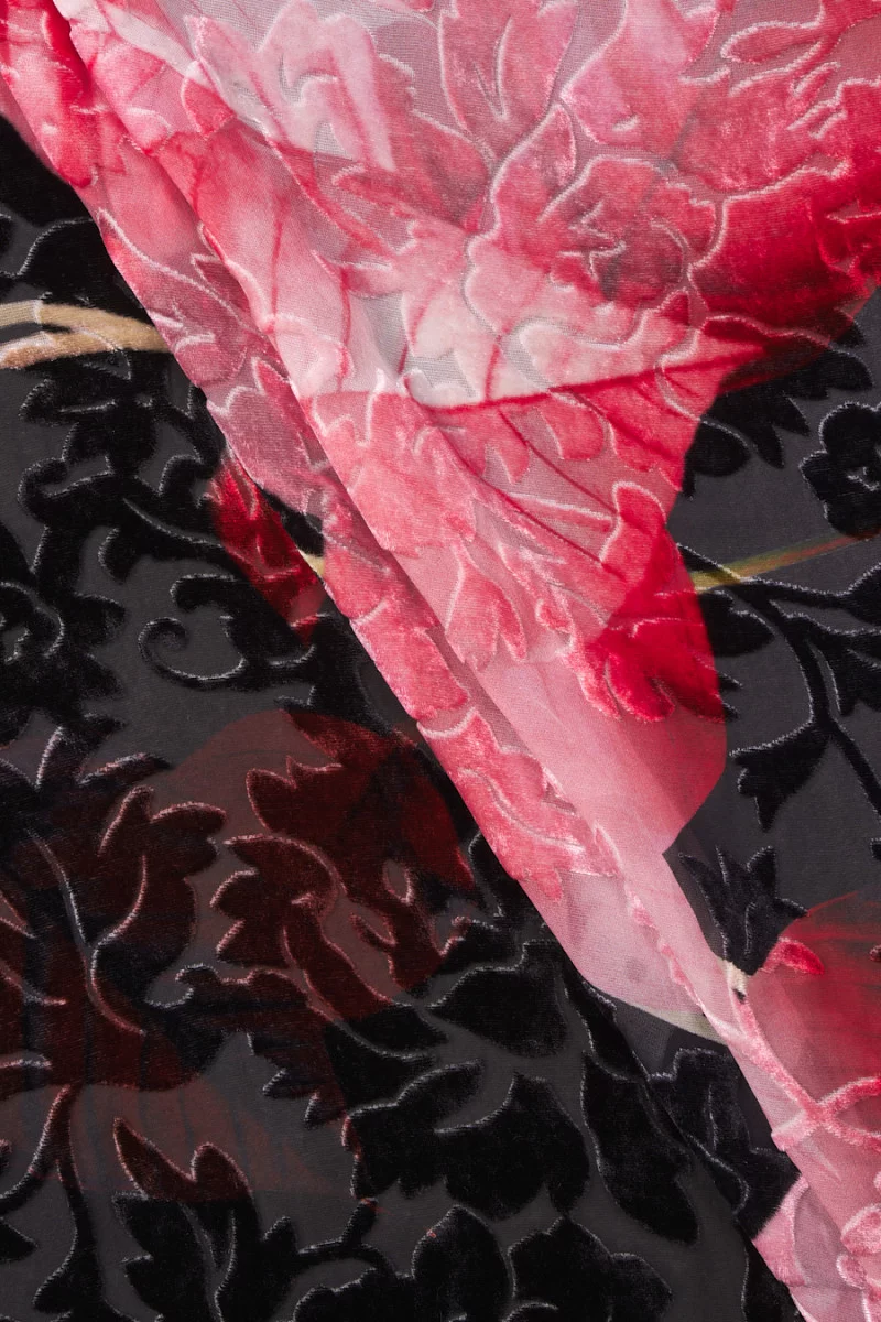 Terciopelo de viscosa-seda italiana del tipo devore con grandes hojas de color rosa rojizo sobre un fondo negro-gris sombreado, el patrón es circunferencial. El tejido devory es una combinación de gasa de seda lisa y transparente con motivos de viscosa opaca y aterciopelada. Tejido fino, transparente, suave y no elástico, perfecto para coser un vestido, una blusa o una falda.