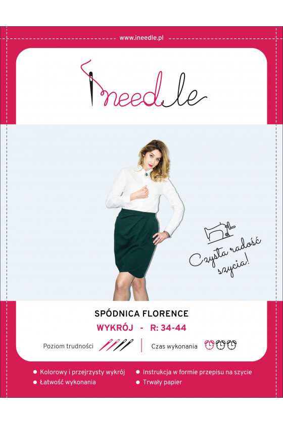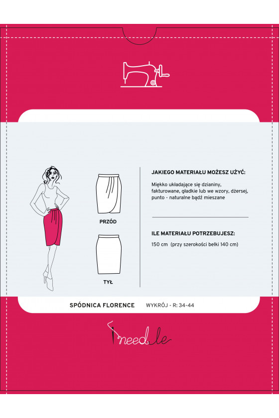 Basado en el patrón de la falda Florence, puedes coser una falda con una cremallera cubierta en la parte posterior y un volante alrededor de la cintura. El efecto arruga se consigue gracias a los pliegues, los llamados "pliegues", que, gracias a que son bastante anchos, se ajustan suavemente a la figura sin provocar el efecto de engrosamiento.
