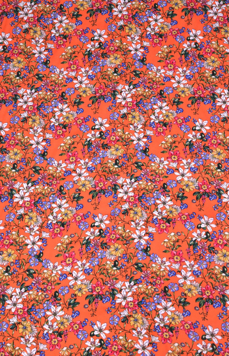 Viste de viscosa con un prado colorido, suave y bien drapeado, de grosor medio. Recomendamos coser vestidos, blusas y faldas de verano con él. No es transparente, puedes coserlo sin forro. Tejido de muy buena calidad. El gramaje también es adecuado para coser camisas de mujer. Recomendamos encogerse previamente antes de coser, ya que las telas de viscosa pueden tender a encogerse. Colores: sobre un fondo naranja: flores blancas, amarillas, azules.